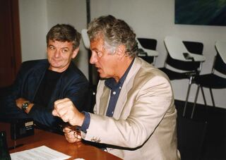 1998 besucht der damalige Außenminister Joschka Fischer (links) SAP, hier im Gespräch mit Gründer Hasso Plattner.