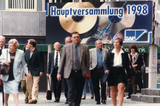 Aktionäre auf der Hauptversammlung 1998. Damals noch mit CD-ROMs auf dem Plakat.