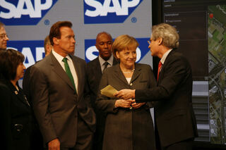 Prominenz auf der Computermesser Cebit 2009 (v.l.): Schauspieler (und damals noch Gouverneur von Kalifornien) Arnold Schwarzenegger, Kanzlerin Angela Merkel und SAP-Chef Henning Kagermann.