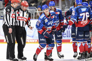 Arkadiusz Dziambor (l.) von den Adler Mannheim im Duell mit Samuel Soramies.
