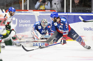 Mannheims Defensive mit Torhüter Felix Brückmann und Thomas Larkin stemmen sich mit vereinten Kräften gegen die Augsburger Offensive.