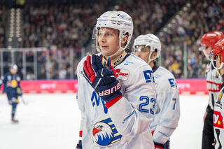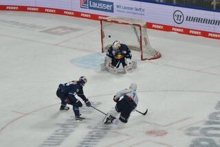 Mannheims Kristian Reichel (Nr.11) trifft zum 1:1 gegen Münchens Evan Fitzpatrick (Nr.31), links Münchens Jonathon Blum (Nr.24).