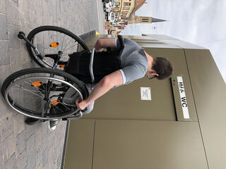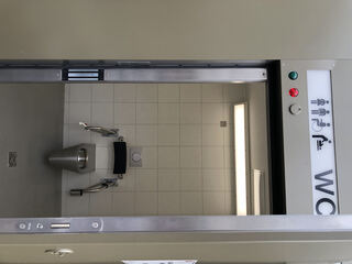 Per Knopfdruck lässt sich die Tür von innen verriegeln, wenn sich das WC nicht gerade im Notmodus befindet.