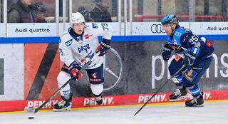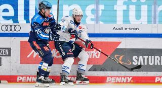 Zach Solow (Nr.73 Adler Mannheim) und Leon Hüttl (Nr.25 ERC Ingolstadt).