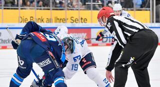 Bully zwischen Myles Powell (Nr.9 ERC Ingolstadt) und Luke Esposito (Nr.19 Adler Mannheim).