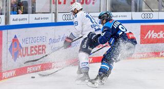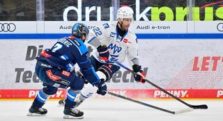 Luke Esposito (Nr.19 Adler Mannheim) und Peter Abbandonato (Nr.98 ERC Ingolstadt).