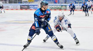 Matthias Plachta (Nr.22 Adler Mannheim) und Chris Jandric (Nr.7 ERC Ingolstadt) beim Spiel.
