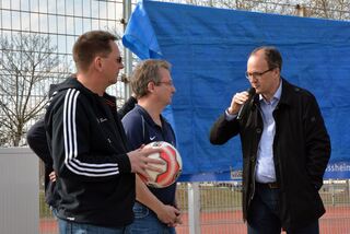 Michael Mattern, stellvertretender Vorsitzender des Fußballkreises Mannheim, SON-Vorsitzender Klaus Worm und Bürgermeister Gunther Hoffmann freuen sich über den neuen Kunstrasenplatz und das Spiel auf Echtrasen gegen den SV Sandhausen.