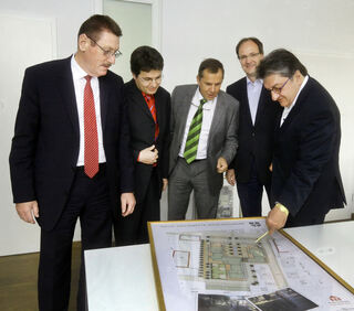 Das sind Eure Räume“: Investor Anton B. Steber (r.) mit den Volksbankdirektoren Dirk Borgartz (Mitte), Heinz Kuppinger (l.), Steuerberater Marcus Gein (2.v. l.) und Bürgermeister Gunther Hoffmann deuten im Mai 2014 auf den Plan der neuen Ortsmitte. Bild: Lenhardt
