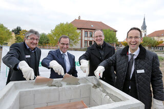 Matthias Ryzlewicz (v.l.), Rudolf Müller, Voba, BM Gunther Hoffmann und Anton B. Steber bei der Grundsteinlegung für die neue Ortsmitte im Oktober 2015. Bild: Lenhardt
