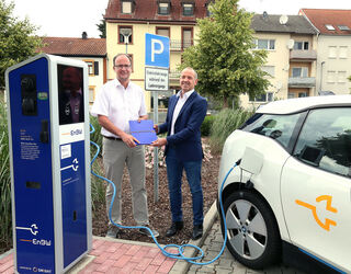 Im Juni 2018 hat die Gemeinde ihre erste E-Ladesäule. Bürgermeister Gunther Hoffmann und Ralf Strohecker von der EnBW nehmen sie am Bahnhof in Betrieb. Bild: Lenhardt