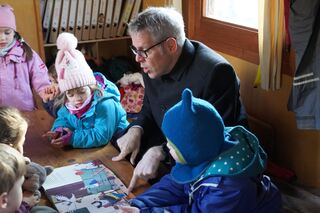Der Lindenfelser Bürgermeister Michael Helbig hat Jungen und Mädchen in der Kita in Winterkasten vorgelesen, die aufmerksam lauschten.