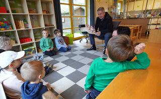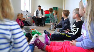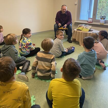 Der Kreisbeigeordnete Matthias Schimpf hat Kindern in der Kita Naturbande vorgelesen.