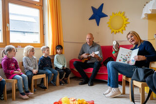 Jeanette Giese wurde bei ihrer Vorlesestunde im Kindergarten Rodau von Peter Moss an der Ukulele begleitet.