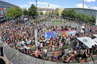 Auf dem Paradeplatz haben die Menschen in Mannheim den CSD gefeiert.