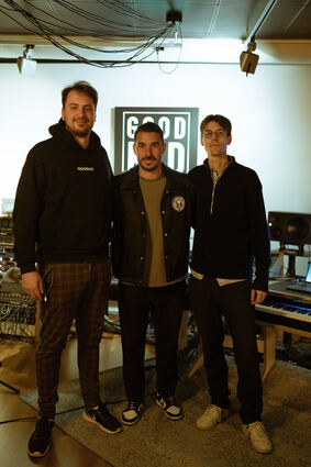 Good Kid Records: Geschäftsführer Moritz Schunk (Mitte) sowie die Top-Songwriter und Produzenten Jules Kalmbacher (links) und Jens Schneider haben 2020 in Mannheim das Label Good Kid Records gegründet. 2022 standen die Musikbusiness-Absolventen schon in den TopTen der erfolgreichsten Labels der deutschen Jahres-Single-Charts vor einigen Branchen-Schwergewichten.