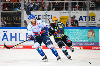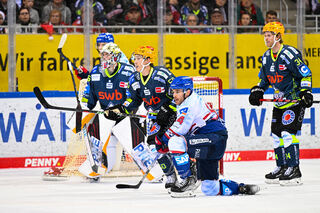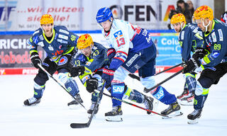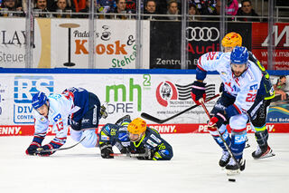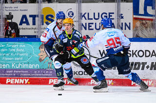 Bremerhavens Ziga Jeglic (Nr.13) gegen Mannheims Stefan Loibl (Nr.13) und rechts Mannheims Mark Katic (Nr.95)