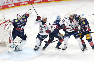 Kampf vor dem Berliner Tor zwischen Thomas Schemitsch (Eisbären Berlin), Jake Hildebrand (Eisbären Berlin und Markus Hännikäinen (Adler Mannheim).