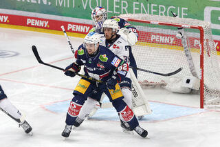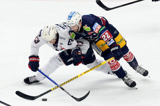 Ordentlicher Zweikampf zwischen Berlins Tobias Eder und Mannheims Markus Hännikäinen.