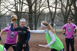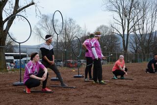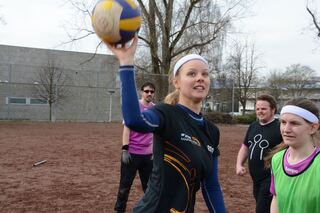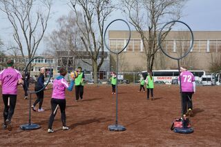 Janina Hardung versucht den Ball durch die Ringe zu werfen.