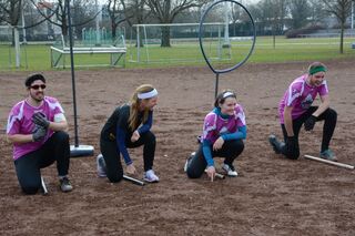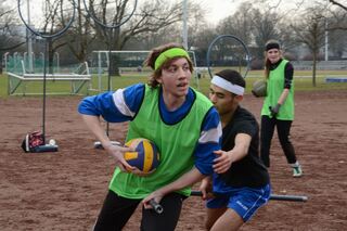 Die Farben der Stirnbändern zeigen die jeweilige Position des Spielers an. Weiß steht für den Jäger - also die Position, die versucht den Ball durch die Ringe zu werfen.