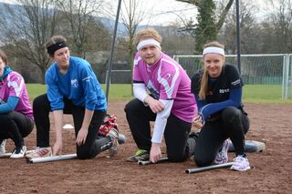 Vor dem Start müssen sich alle Mitspieler auf den Boden knien. Die PVC-Stangen - als Besen - liegen zwischen den Füßen.
