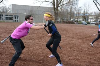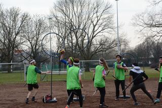 Nach 18 Minuten wird der Schnatz (ein neutraler Spieler, links im Bild) ins Spiel gebracht. Die zwei Spieler mit gelben Stirnbändern sind die Sucher und versuchen den Tennisball, der in einer Socke am Hosenbund des Schnatzes befestigt ist, zu fangen.