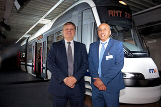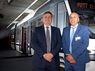 Petr Brezina (Vorstandsvorsitzender und Generaldirektor der koda Transportation Gruppe) und Saad Alkhargi (Projektmanager RNV) vor dem Vorführmodell.
