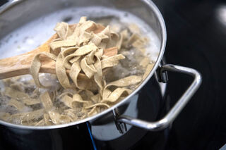Eine Köchin rührt bei einer Verkostung von Insektenpasta der Plumento Food GmbH in einem Kochtopf mit Nudeln. Das Unternehmen Plumento Food entwickelt und vertreibt Lebensmittelprodukte, die unter anderem Insektenmehl als Bestandteil haben.