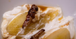 Eine pochierte Birne an Joghurt ist mit einer in Honig gebratenen Heuschrecke garniert.