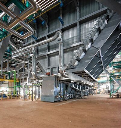 Vier mächtige Kohlemühlen - jede zehn Meter hoch - mahlen die Steinkohle staubfein. Anschließend wird sie in den Kessel eingeblasen, wo sie im Flug verbrennt. Eine Mühle kann bis zu 65 Tonnen pro Stunde mahlen, etwa das Fassungsvermögen eines Güterwaggons.