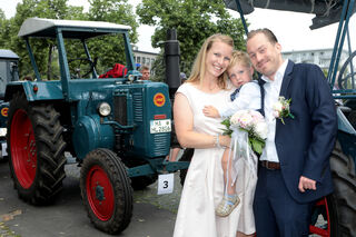 Max und Madeleine Rother (mit dem zweijährigen Marlon) heirateten am Samstag - und nutzten die Traktoren-Parade sogleich als Fotomotiv.