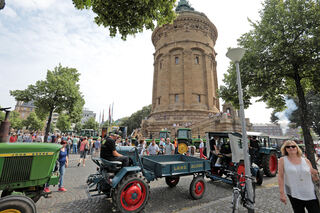 Ein eher seltener Anblick in der Mannheimer Innenstadt: Traktoren in schier endloser Reihe.