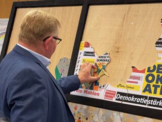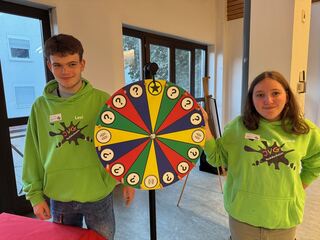 Die Jugendvertreter Levi Betz (l.) und Emma Keller am Glücksrad. Richtige Antworten auf Fragen rund um die Demokratie wurden mit Süßigkeiten belohnt.