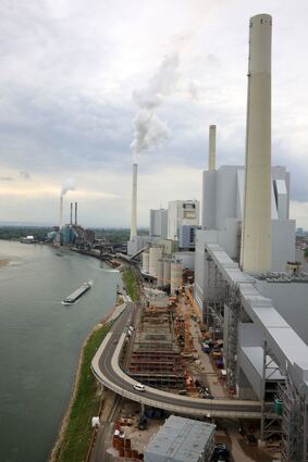 Der neue Block 9 am Rheinufer mit seinem 180 Meter hohen Schornstein.