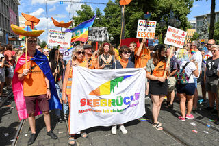 Auch die Aktion Seebrücke, die sich für eine grundsätzliche Aufnahme von Flüchtlingen einsetzt, lief beim CSD 2019 in Mannheim mit.