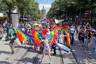 Perfekt geschminkte Dragqueens in glitzernden Outfits und High Heels flanieren stolz über die Straße oder fahren in Cabrios.