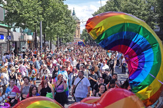 Die Parade, die sich gegen Diskriminierung der LGBTQIA*-Community stark macht, hat die Quadrate in ein buntes Farbenmeer verwandelt.