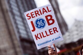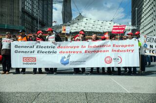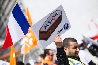 epa05249575 Demonstrators hold a banner stating 'General Electric destroys European Industry' during a protest next to Alstom headquarter as a European Alstom staff gathering at La Defense in Paris, France, 08 April 2016. The gathering takes place as Alstom-GE announced the reduction of 6500 jobs. EPA/ETIENNE LAURENT +++(c) dpa - Bildfunk+++
