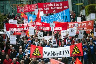 epa05249571 Demonstrators hold a banner stating 'Gierig und Ehrlos oder Greedy and Execrable' during a protest next to Alstom headquarter as a European Alstom staff gathering at La Defense in Paris, France, 08 April 2016. This gathering takes place as Alstom-GE announced the reduction of 6500 jobs. EPA/ETIENNE LAURENT +++(c) dpa - Bildfunk+++