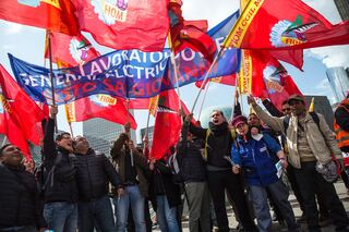 dpatopbilder epa05249574 Demonstrators protest next to Alstom headquarter as a European Alstom staff gathering at La Defense in Paris, France, 08 April 2016. The gathering takes place as Alstom-GE announced the reduction of 6500 jobs. EPA/ETIENNE LAURENT +++(c) dpa - Bildfunk+++
