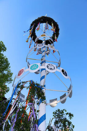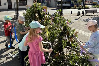 Die Vorschüler aus dem Haus der kleinen Hasen schmücken den Maibaum