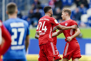 Joshua Kimmich bejubelt mir Corentin Tolisso den Anschlusstreffer zum 1:2.