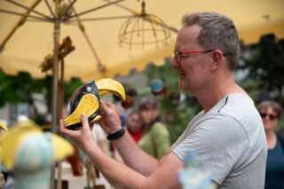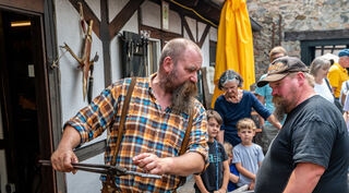 Weinfest Zwingenberg mit Bauern- und Handwerkermarkt. Schmiedearbeit im Museumsgarten mit Andreas Roth (links) und Alexander Groh.