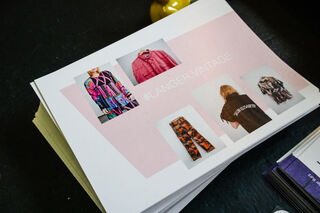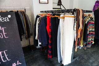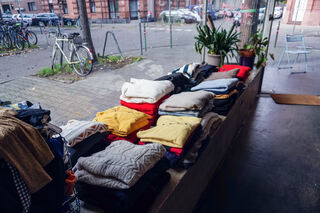 Der Blick von der Empore auf die Kleidung im Verkaufsraum.