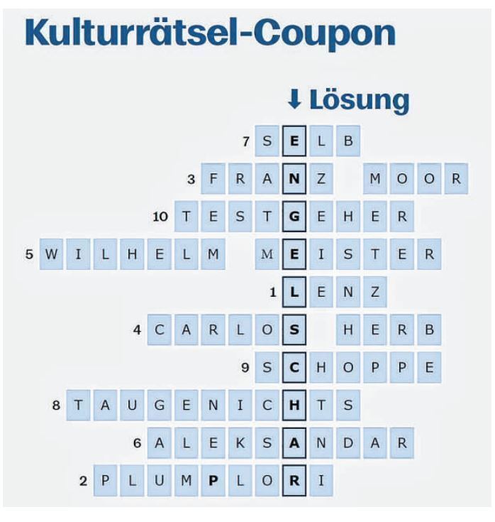 Mannheim. Wer in den Tagen des Jahreswechsels die zehn Teile des Kulturrätsels gelöst hat, erhielt am Ende das Lösungswort „Engelschar“. Etwa 1500 Einsendungen haben die Redaktion zu Beginn des Jahres erreicht. 300 mehr als im Vorjahr. Fast alle hatten die richtige Lösung gefunden. Von 11. Dezember 2021 bis 7. Januar 2022 hatte das alljährliche Quiz der Kulturredaktion das Wissen rätselbegeisterter Leserinnen und Leser gefordert. Nach Denkmälern in der Region beim letzten Mal wurden nun literarische Figuren gesucht - unter anderem Georg Büchners Lenz, Goethes Wilhelm Meister oder auch Ingrid Nolls „Plumplori“.