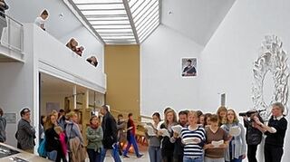 Und dann ist da noch die lange Nacht der Musik - zumindest ließe sie sich unter diesen Namen problemlos einführen, denn fast immer startet irgendwo eine Performance oder ein Konzert. Im Kunstverein inszeniert Ulf Aminde seine Ausstellung mit einem sprechenden, flüsternden, rufenden "Chor der Unterbrechung" aus Studenten, der fast eine Stunde lang den Raum durchschreitet und dabei "dringlich", "klerikal" oder "besserwisserisch" spricht. In der mit einer riesigen Goldfolie ausgehängten Jesuitenkirche gibt es wunderbaren "Jazz am Flügelaltar" und im Museum Haus Cajeth präsentieren die Pianistin Miriam Weiss und der Fotograf Jessen Oestergaard träumerische "Soundlines", um nur einige Angebote zu nennen - einige von vielen, die man gesehen haben sollte.