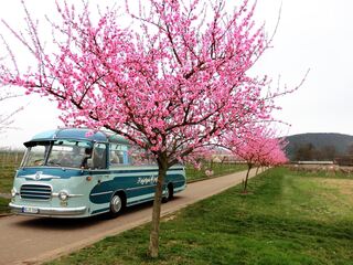 Zurück in die 50er heißt es bei der Genuss-Tour im Oldtimer Panoramabus durch die prachtvoll blühenden Mandelbäume in der Pfalz. Die Route führt vorbei an Weinbergen und Mandelbäumen zu den besten Weinorten in der Pfalz.