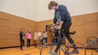 Mit einem leichten Grinsen auf dem Gesicht holt Thorsten Forell jetzt ein Einrad aus dem Nebenraum. „Eigentlich ist es ganz einfach. Den Sattel zwischen die Beine klemmen, das Rad vor dem Körper auf dem Boden positionieren, in die Pedale treten und es richtet sich von allein auf.“ Es sieht bei ihm auch so aus, als sei es „eigentlich ganz einfach“, wenn er sich auf das Rad schwingt und darauf balancierend scheinbar mühelos vor und zurück fährt. Doch die Realität eines blutigen Anfängers ist eine völlig andere. Ja, das Rad stellt sich von allein auf, wenn man in die Pedale tritt. Darauf sitzenzubleiben und zu balancieren, ist jedoch eine völlig andere Geschichte. Auch mit einer Hand an der Sprossenwand ist es alles andere als einfach, die Balance zu halten. Genauso schnell, wie das Rad sich aufrichtete, geht es auch wieder in Richtung Boden. Einradfahren braucht wohl doch etwas mehr Übung als eine Stippvisite beim RV-Training. Die Vereinsmitglieder flitzen derweil unbeirrt weiter auf dem Einrad durch die Halle, als wäre es das normalste und einfachste Fortbewegungsmittel der Welt.
