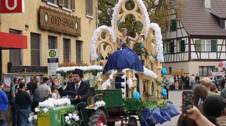 Jede Menge Applaus gab es für den jüngsten VzEdT-Nachwuchs im Planwagen. „Da ist bestimmt so manche künftige Begleitdame dabei“, freute sich Christiane Hiemenz. Derweil strahlten die aktuellen Begleitdamen Ciara Benedikt, Maya Böhm, Marie Fillauer, Anna Gundolf, Leonie Jäger und Emilia Weis von ihrem Wagen in die Menge. Höhepunkt des Umzugs war natürlich der Prunkwagen von Kerwekönigin Lina Lulai. Der von Jochen Diehl gestaltete Aufbau erinnerte diesmal an ein stilisiertes Märchenschloss mit Kuppel.